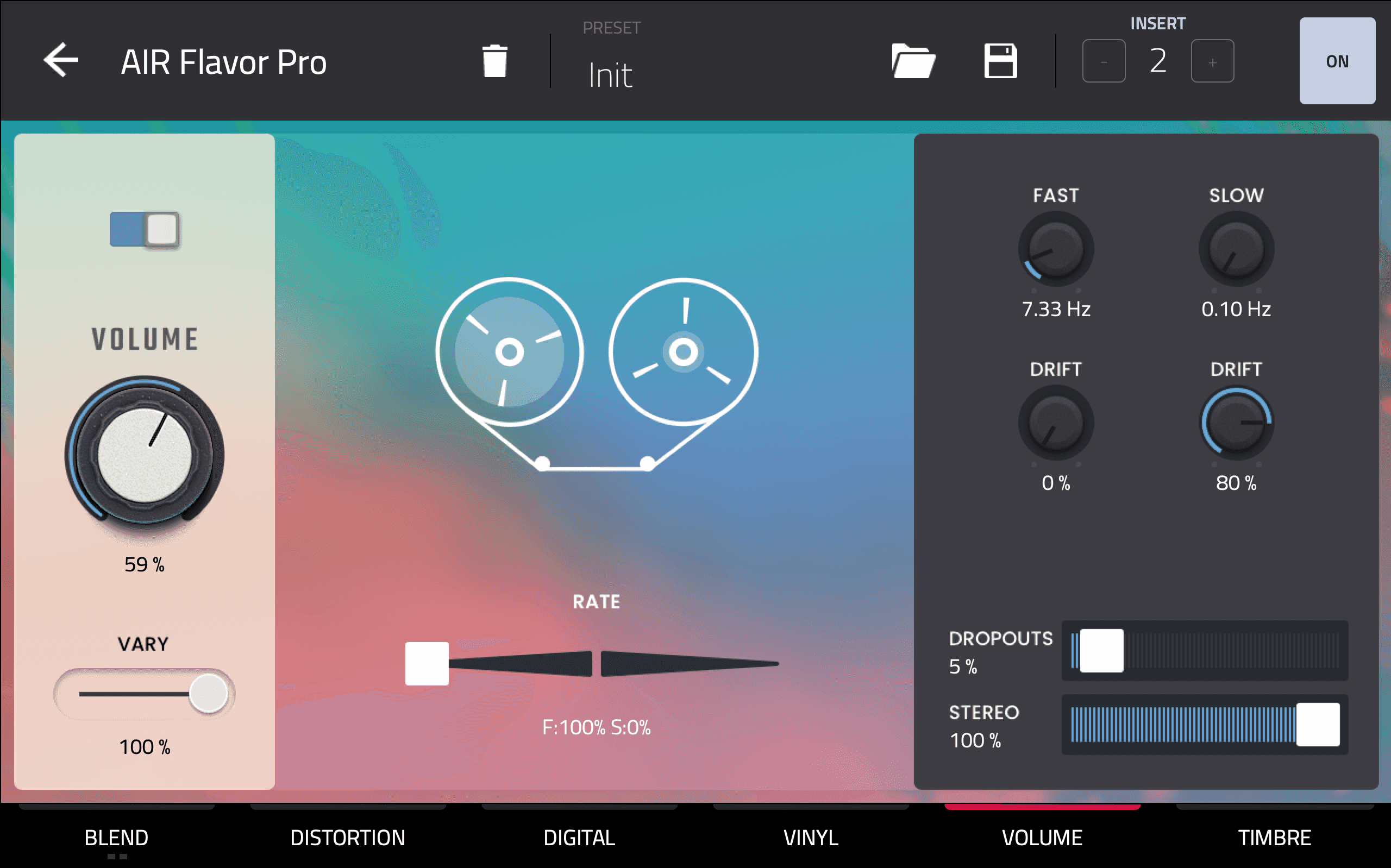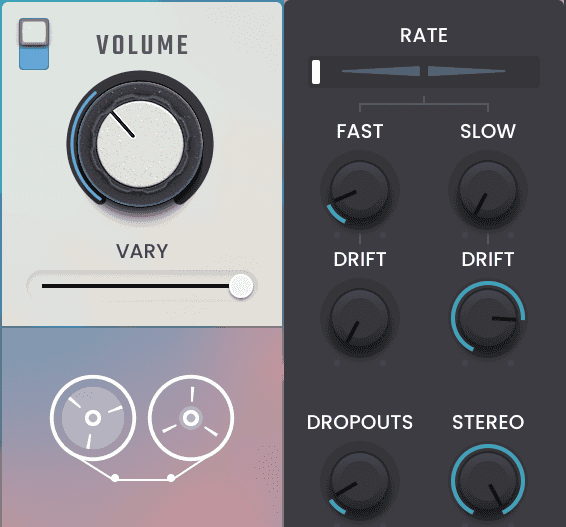 Emulate the behavior of Reel 2 Reel Tape adding dropouts and drift. With dedicated controls for Rate amount, Fast/Slow Speed, Drift, Dropouts, Stereo width, Mix, and Vary Control.