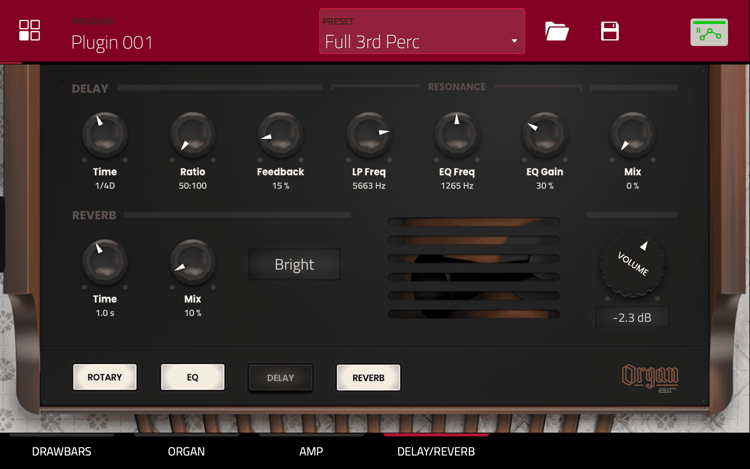 Organ includes multiple effects like rich reverbs, delays, and EQ. Create deep and warm organ patches with tons of life and realism by using the built-in effects included with the instrument. Delay effects allow you to adjust time, ratio, feedback, mix, and resonance filtering. Reverb models include Soft, Bright, Studio, Chamber, Hall, and Ambient, all with feedback and mix controls.