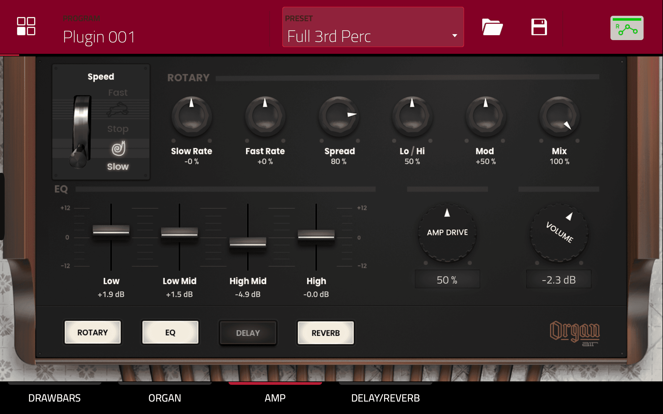 The swirling speaker effects of Organ come from AIR Music Technology’s award-winning rotary emulation engine, allowing you to dial in an authentic organ sound. Adjust slow and fast rate, stereo spread, hi/lo tone, modulation, and the overall wet/dry mix. You can then adjust the speed of the rotary to get that modulated organ sound!