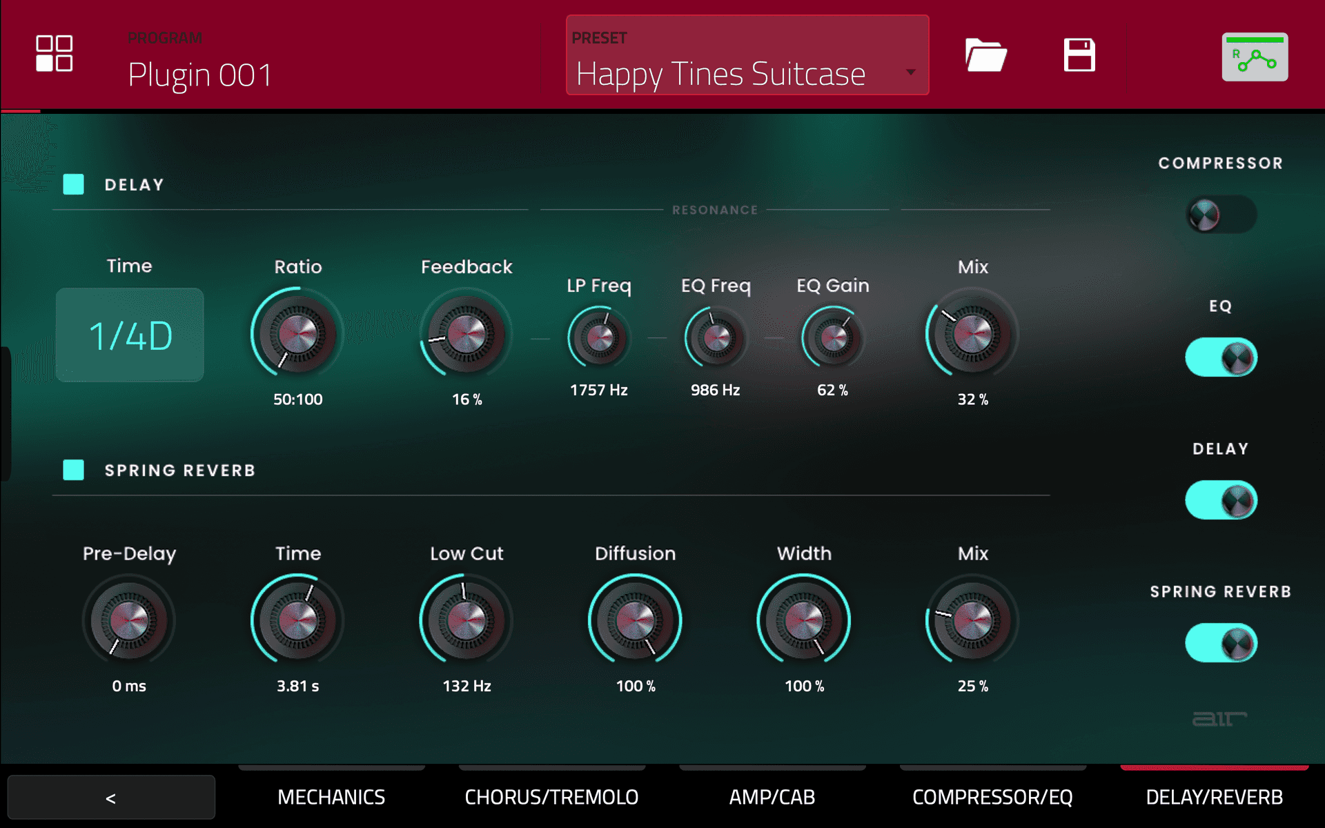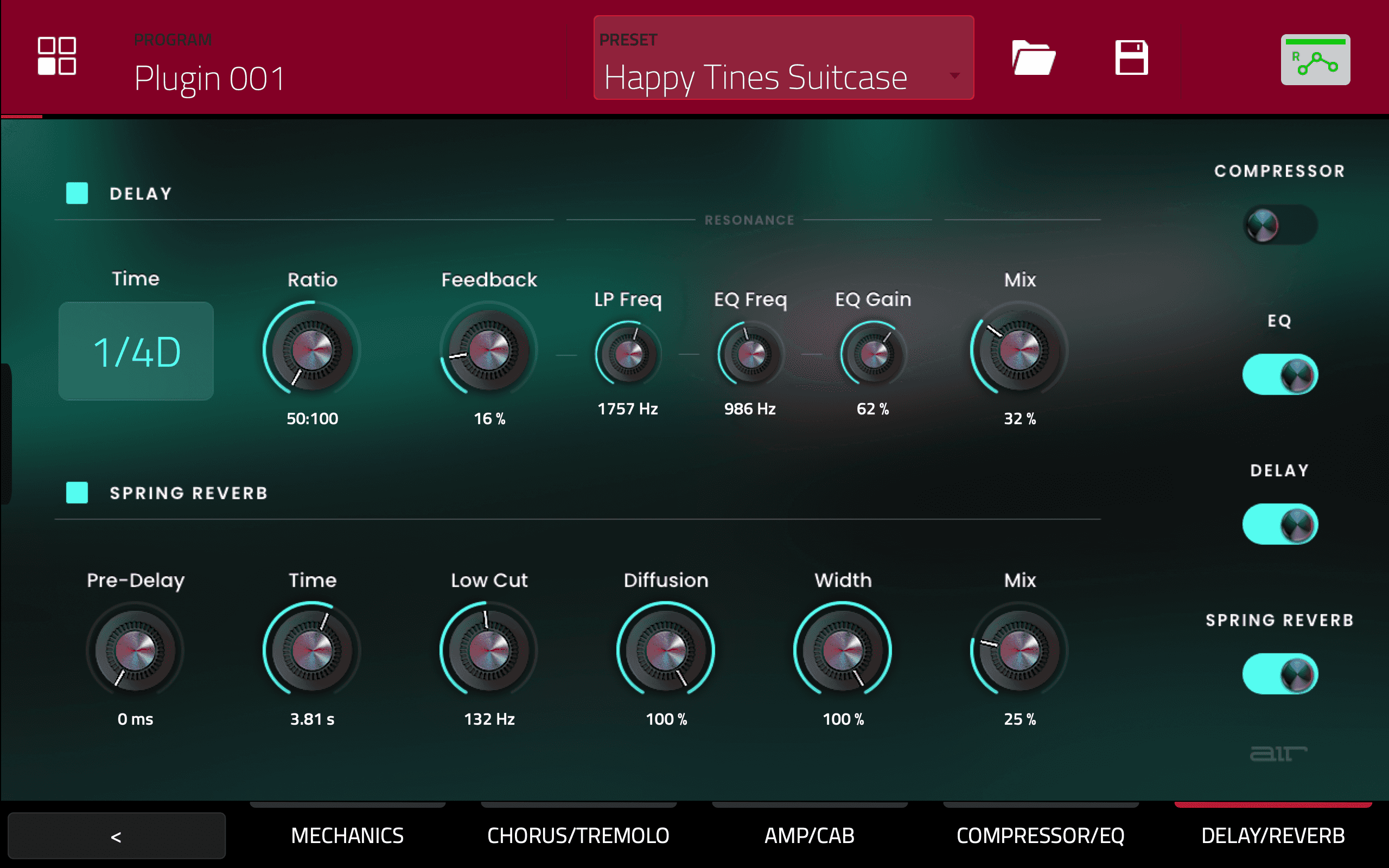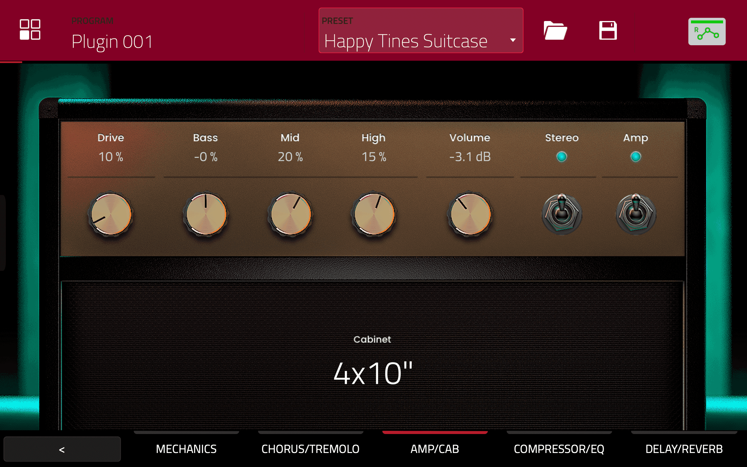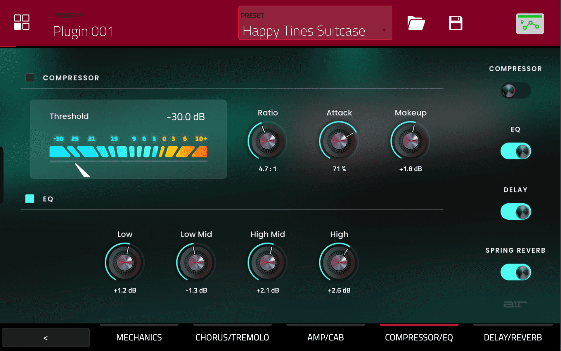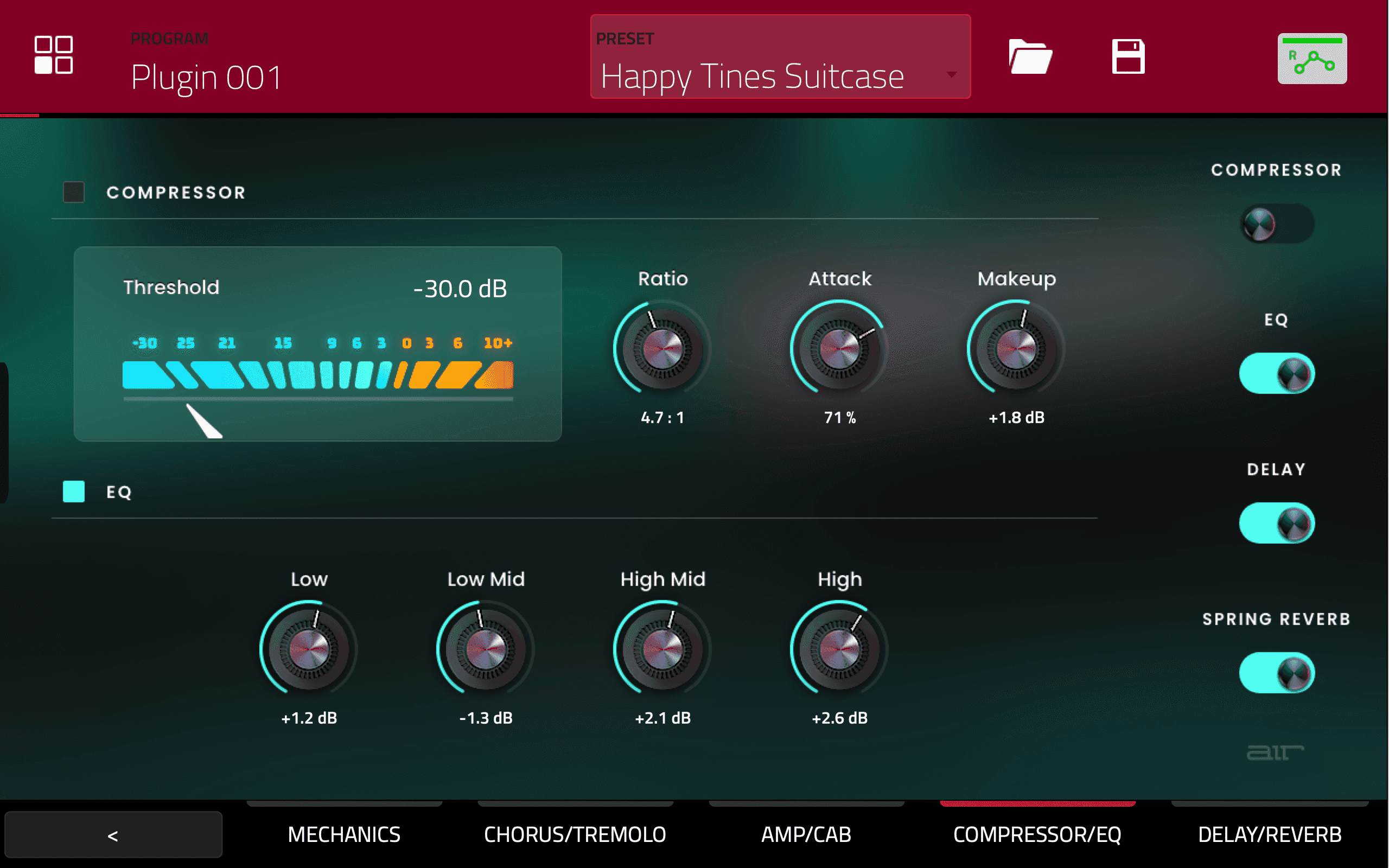 - Built-in effects include amp and cab sims, chorus, tremolo, EQ, compression, and more!