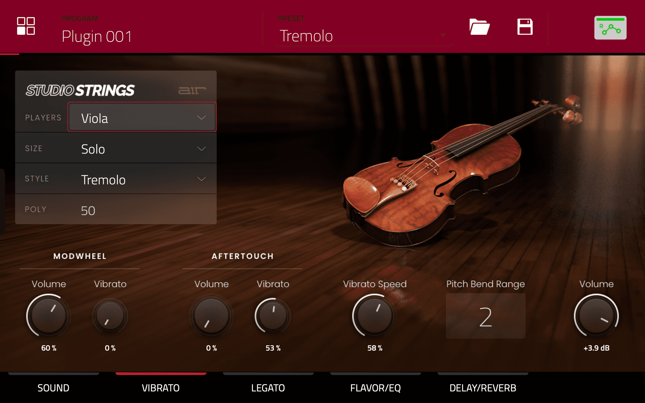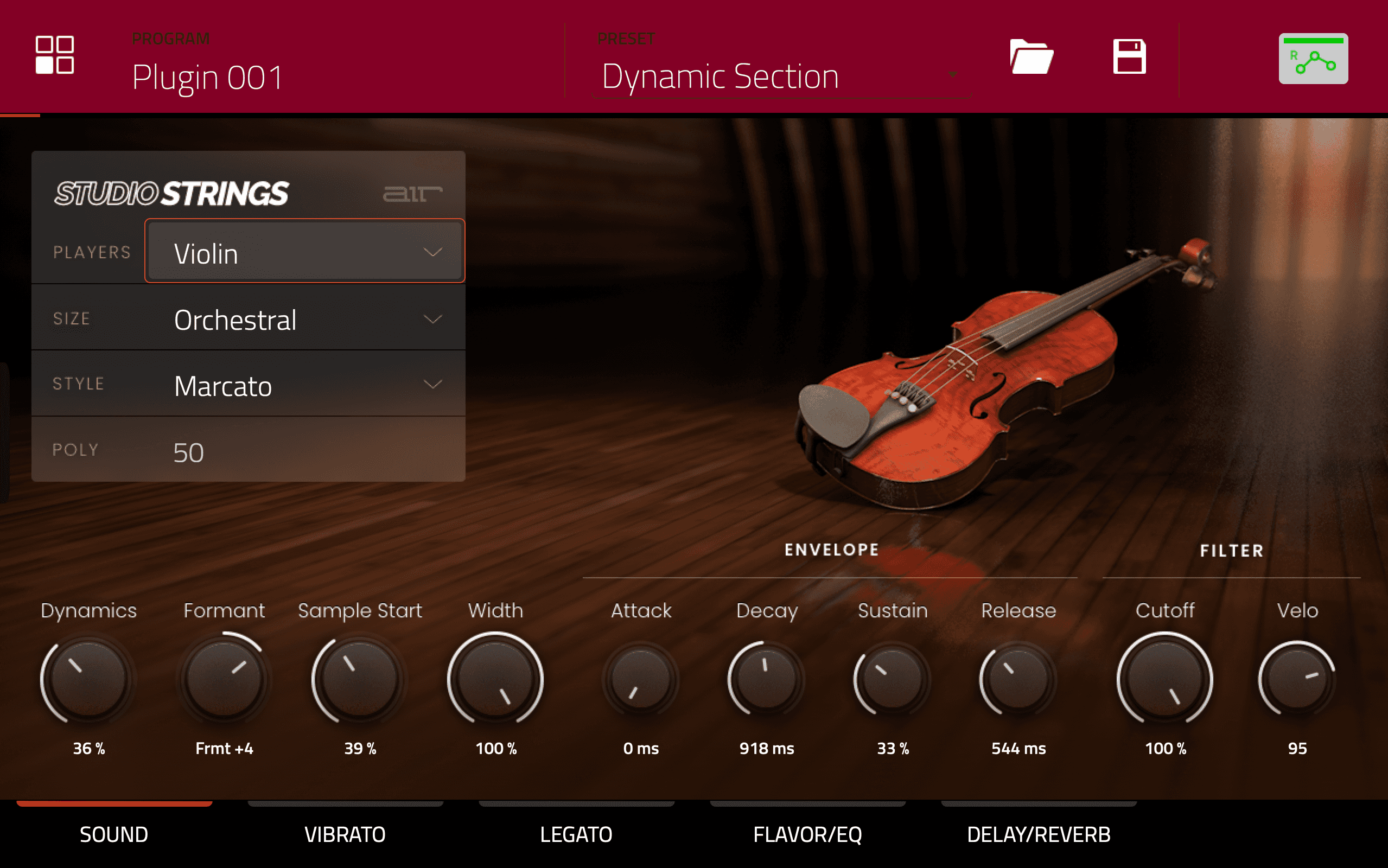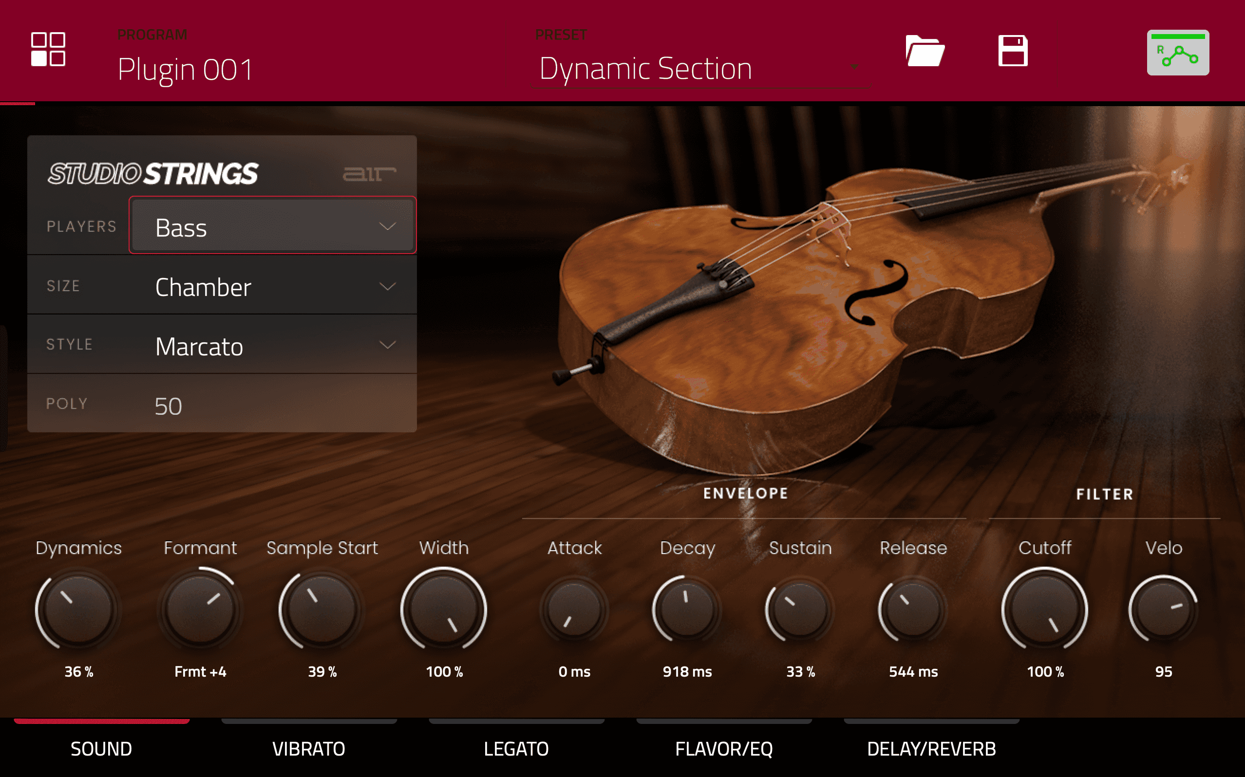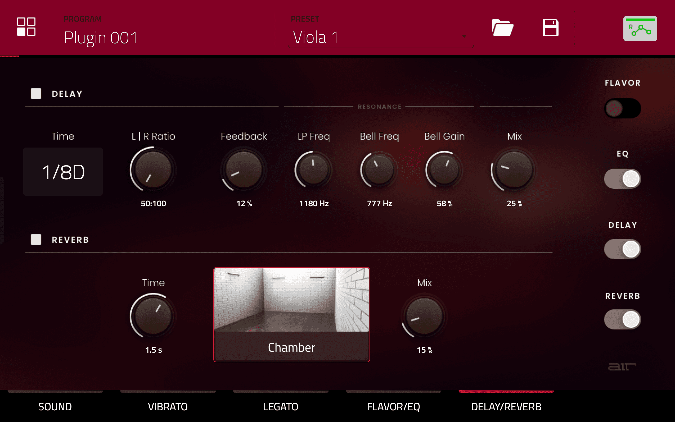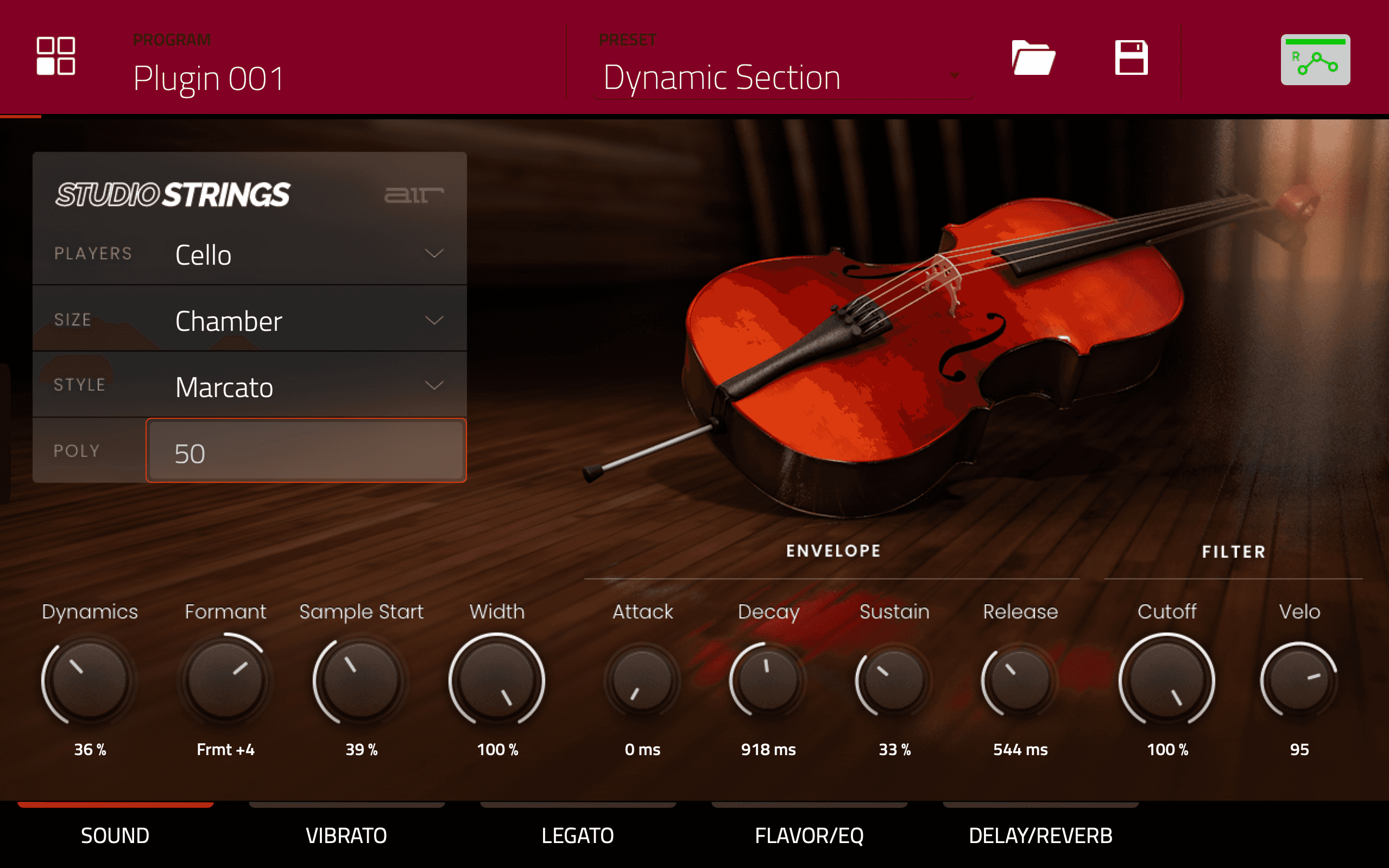 - Craft your original string sound with 30 flavor timbre effects, plus delay, EQ, and reverb.