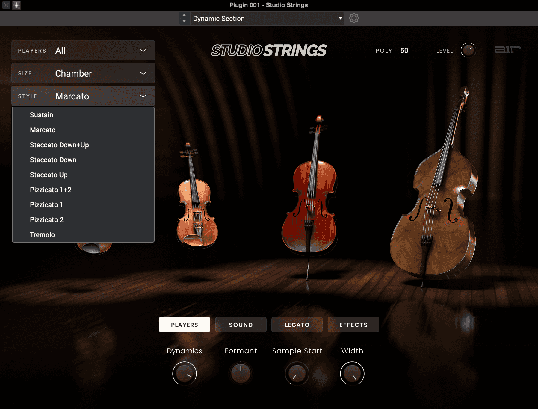 Studio Strings features authentic string instruments with advanced articulation options that let you craft the perfect string section and play style for your production. Multiple articulations are available per instrument, including Staccato Up/Down, Pizzicato, Sustain, Tremolo, Marcato, Legato, and more.